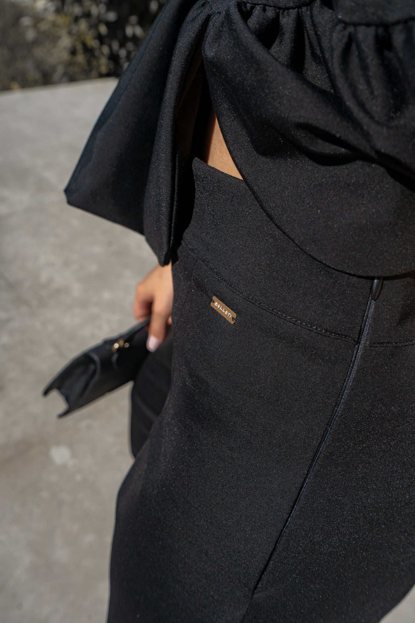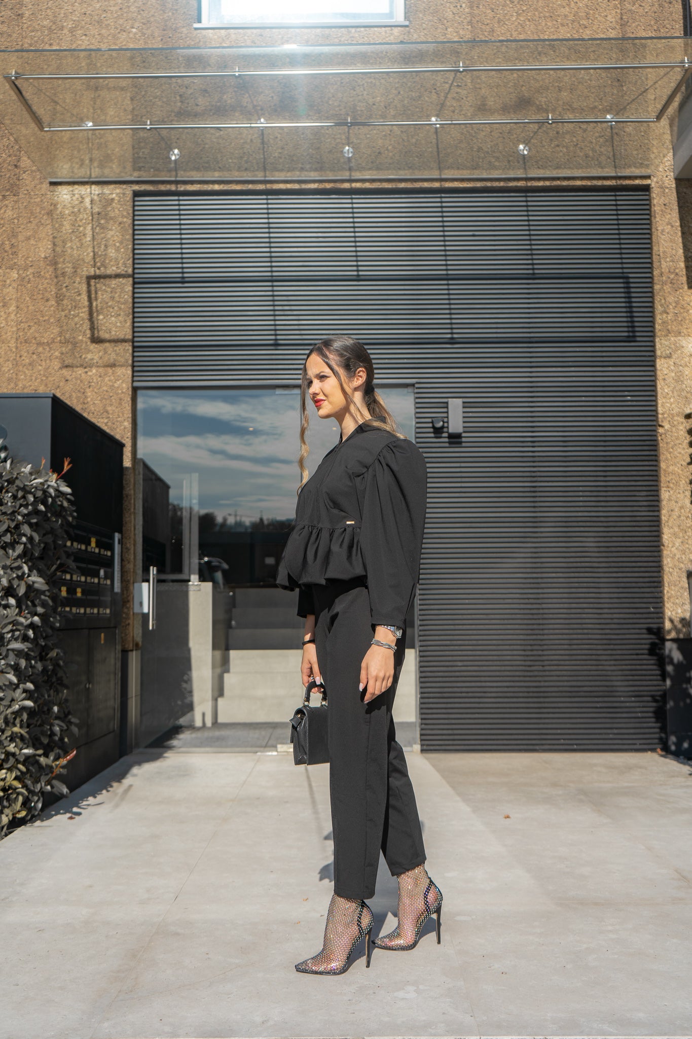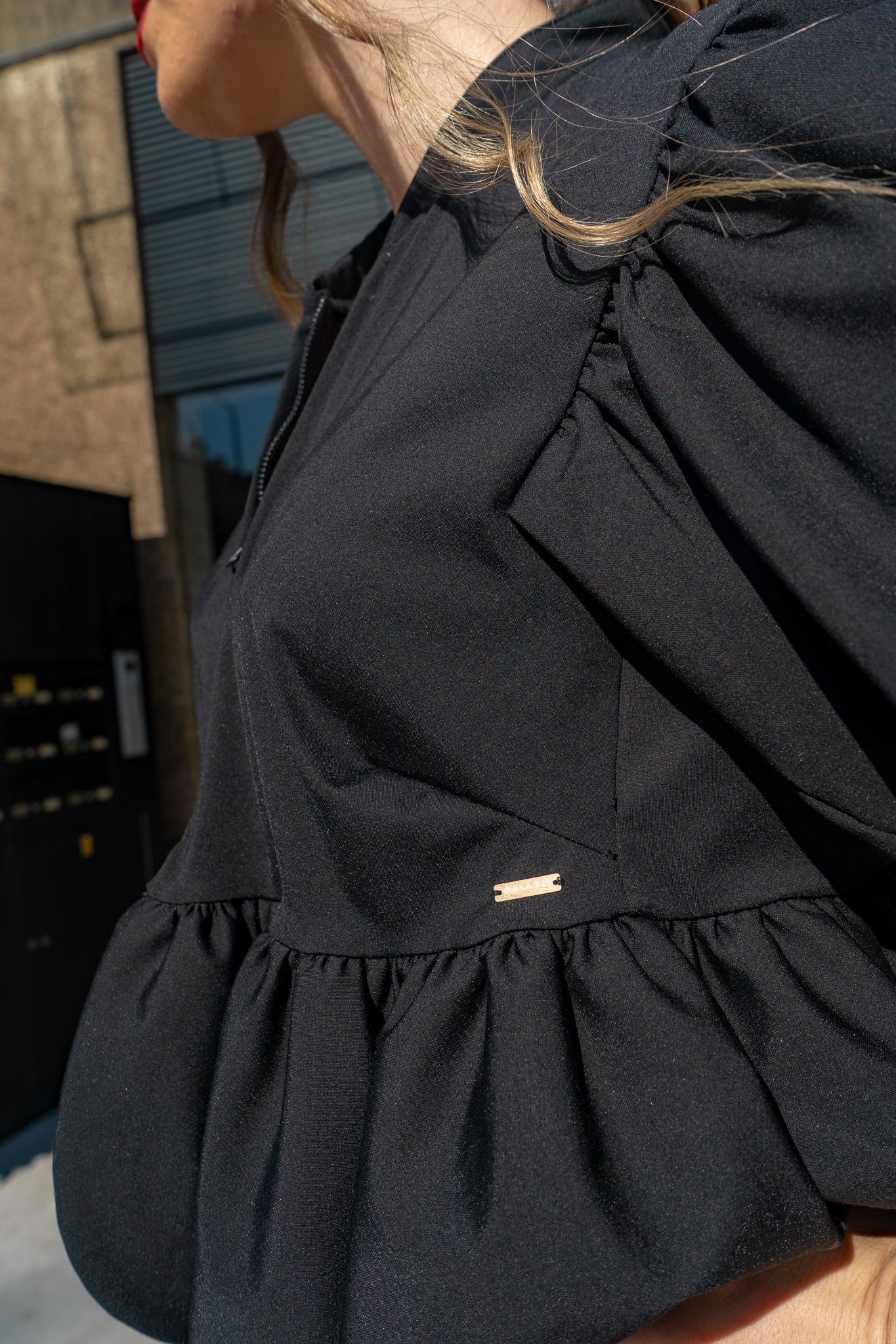 Conjunto em tecido de 2 peças: Casaco e calça. Casaco de gola de colarinho e manga comprida abalonada. Fecho à frente com fecho de correr oculto na costura. Pormenor de folho com pinças. Calças de cintura subida e pouco elastano, fecho invisível na lateral.