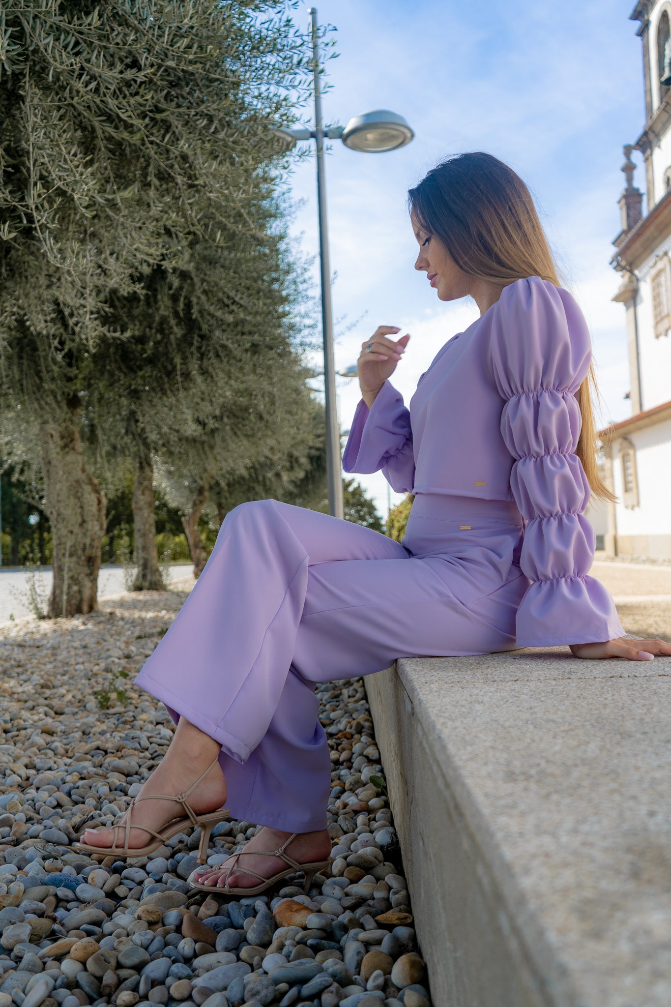 Conjunto em tecido de 2 peças: top e calça. Top decote redondo, com manga comprida e pormenor na manga. Calças de cintura subida e pouco elastano, fecho invisível na lateral. Corte reto. Disponível em cor telha, preto, bege e branco.