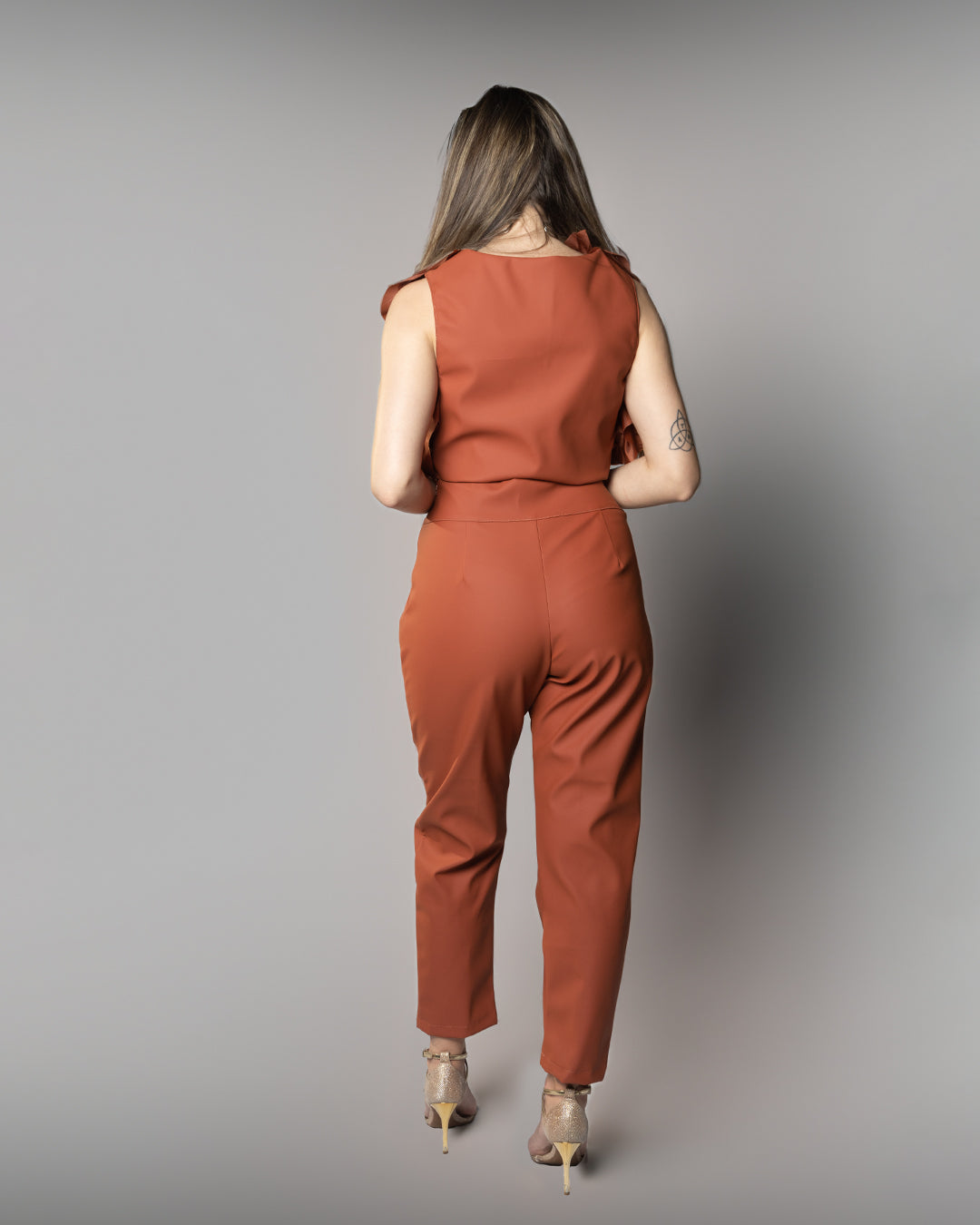 ✔ Design marcante: Top cropped com folhos estruturados e laço frontal, combinado com calças de cintura alta para um caimento impecável.