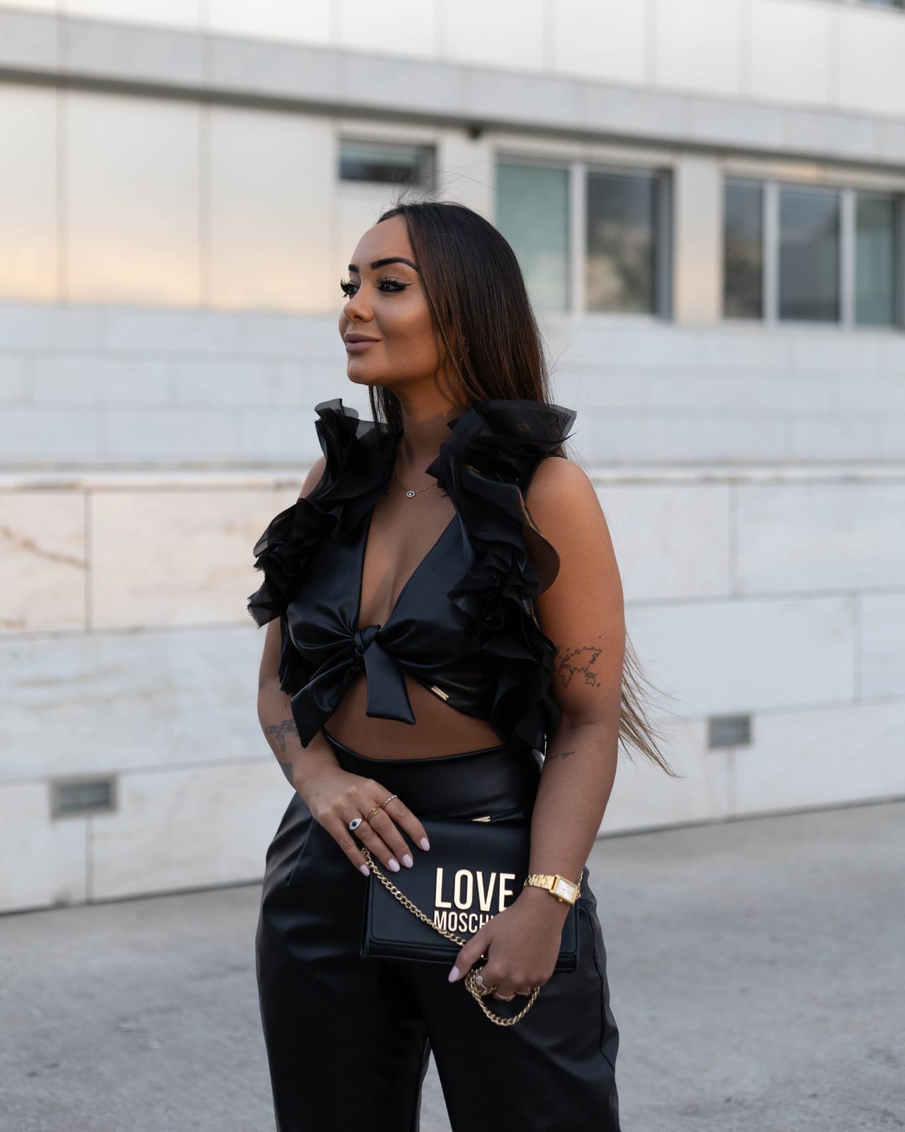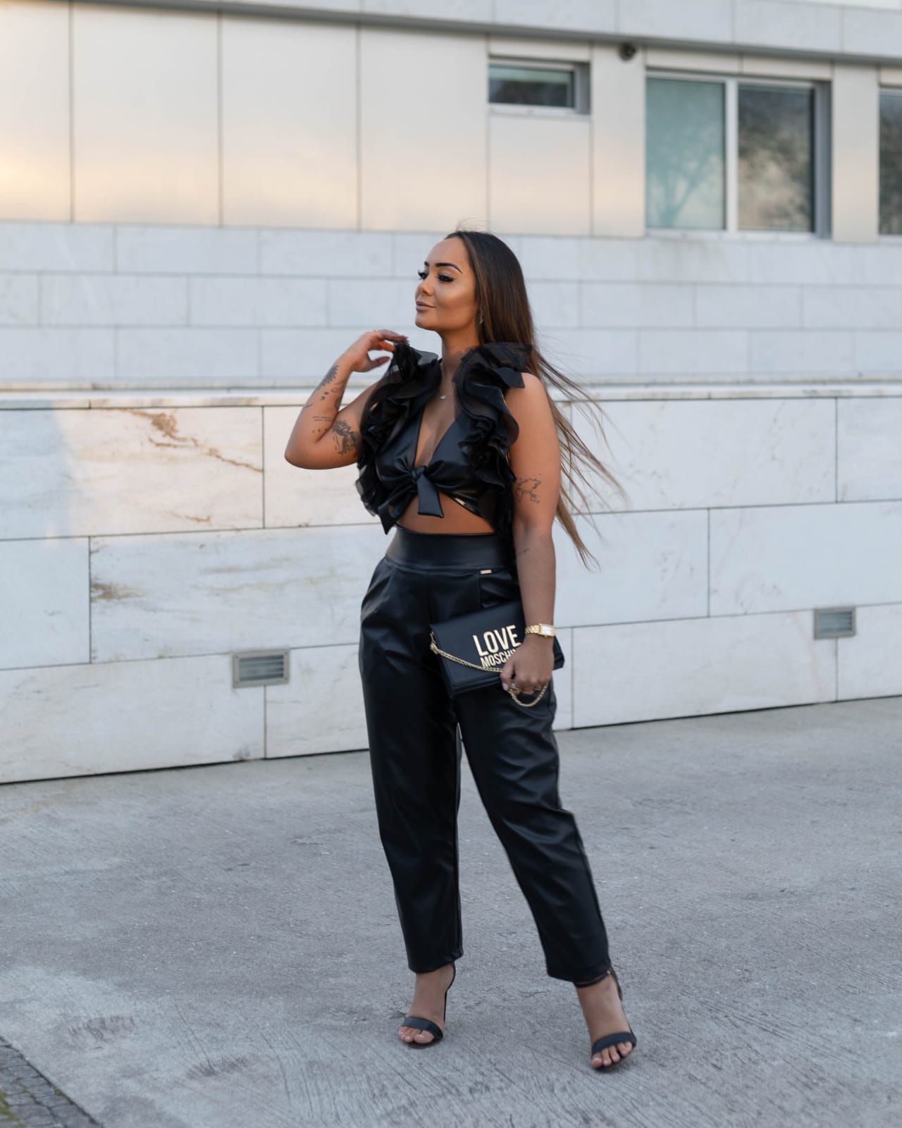 Eleva o teu estilo com este conjunto sofisticado e ousado! Feito em eco-pele, combina um toque moderno com conforto, garantindo um look elegante e poderoso para qualquer ocasião.
