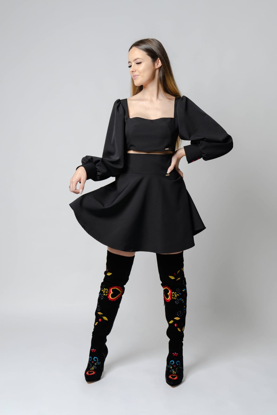 Conjunto em tecido de 2 peças: top e saia. Top decote quadrado, com manga comprida e punho. Fecho na lateral. Saia de cintura subida e pouco elastano, fecho invisível na lateral.